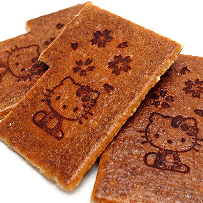 ハローキティの絵柄がデザインされた瓦せんべい(中)5枚 箱入です。